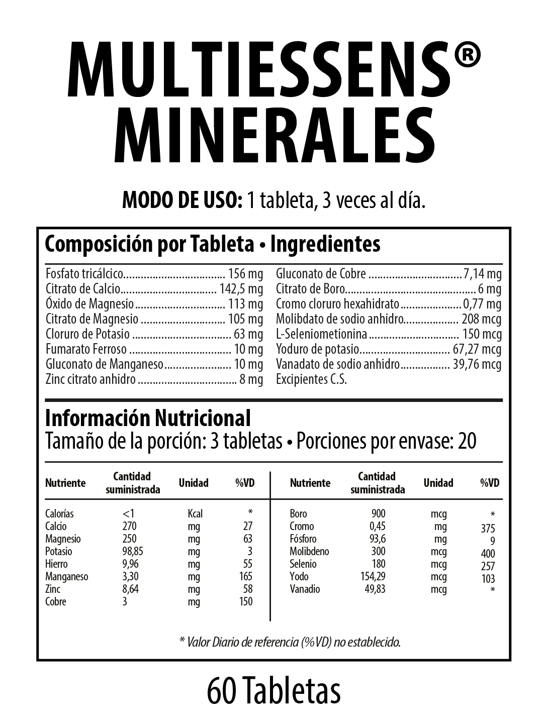Fórmula con Minerales esenciales biodisponibles. Es un producto de soporte nutricional cuyo propósito es agregar a la dieta normal, siendo fuente concentrada de nutrientes y otras sustancias con efecto fisiológico o nutricional.